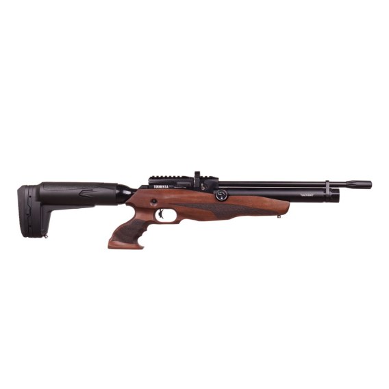 Reximex Tormenta W, nowoczesna wiatrówka PCP w kompaktowej, taktycznej osadzie z chwytem pistoletowym wykonanej z orzecha tureckiego. Karabin wyposażony został w dźwignię napinania Side Lever, regulowaną stopkę, pojemny podwójny kartusz, gwintowaną lufę. Dostępny w kalibrach: .177 (4.5 mm), .22 (5.5 mm), .25 (6.35 mm).